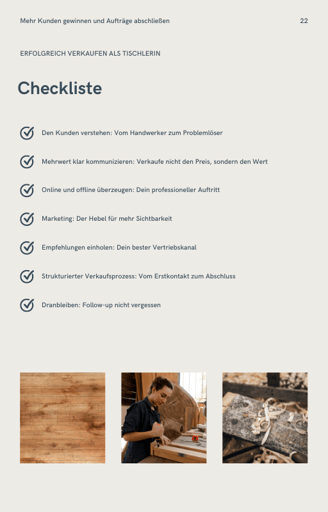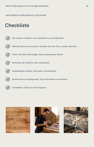 Dieses E-Book zeigt dir, wie du trotz dieser vielen Aufgaben deinen Vertrieb optimierst, mehr Kunden gewinnst und mehr Aufträge abschließt, ohne dabei deine Werte und deine Leidenschaft für das Handwerk aus den Augen zu verlieren.